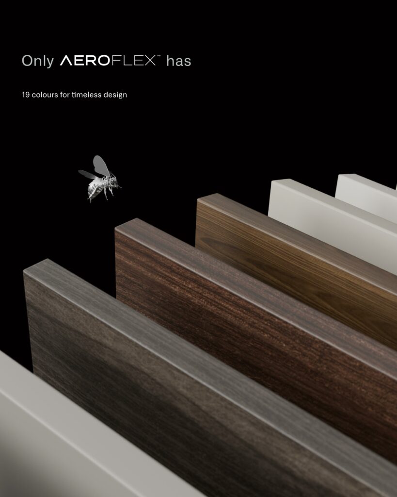 Aluminium no longer means rigid or industrial. AEROFLEX™ allows for clean lines, soft curves, and a choice of 19 colours to suit different design styles.
